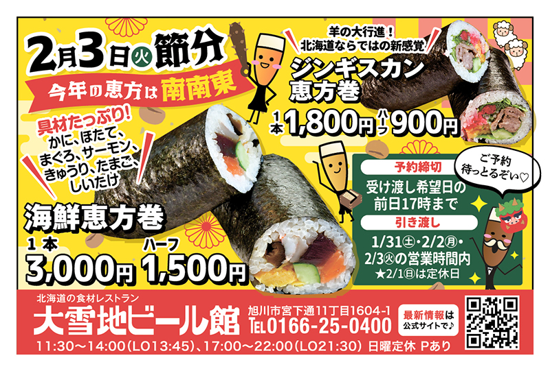 節分の縁起担ぎに、ぜひ大雪地ビール館の恵方巻をご賞味ください。